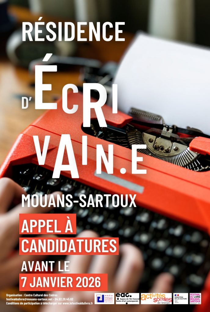 Dans le souci d’encourager les pratiques culturelles liées au livre, à l’écriture et à l’art, l’association Centre Culturel des Cèdres de Mouans-Sartoux propose, en partenariat avec la Direction régionale des affaires culturelles PACA, et avec le soutien de l’Espace de l’Art Concret et des Activités Sociales de l’énergie (CCAS, CMCAS de Nice) une résidence d’artiste à un.e auteur.e de littérature adulte.